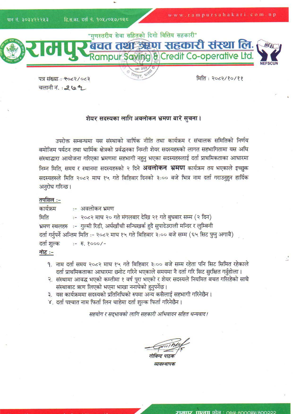 शेयर सदस्यका लागि अध्ययन अवलोकन भ्रमण बारे सूचना ।