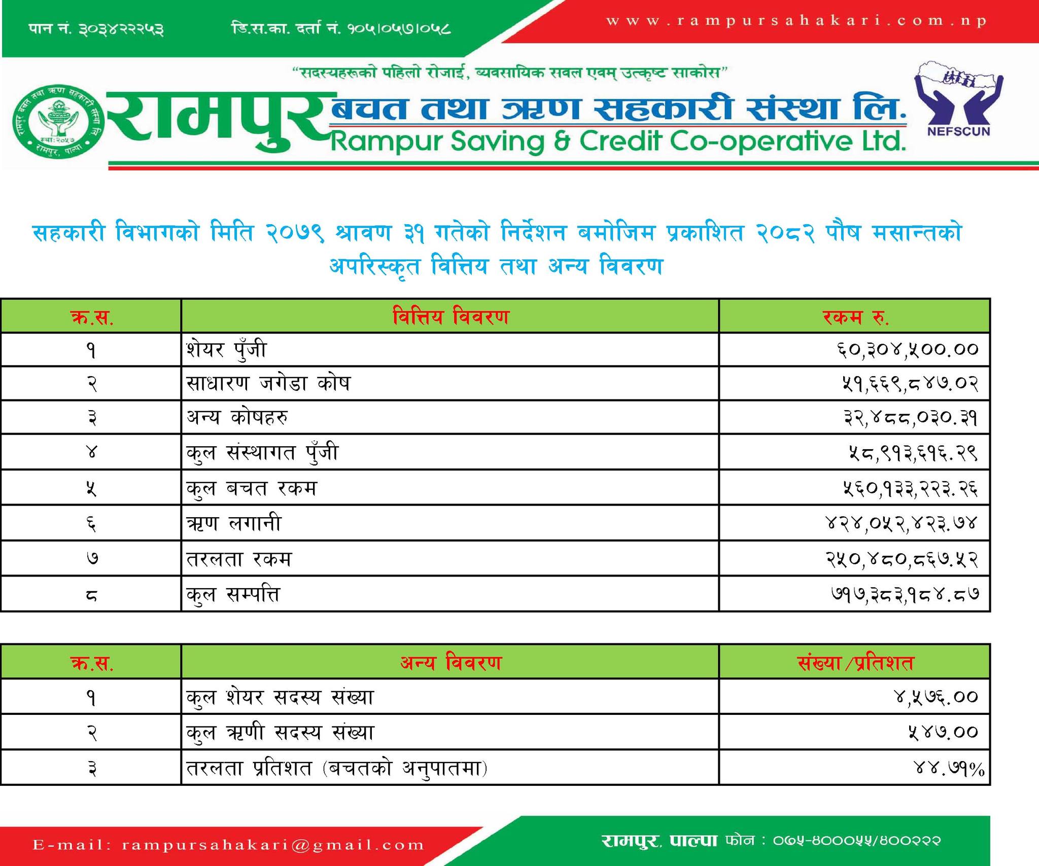 २०८२ पाैष मसान्तकाे अपरिस्कृत वित्तिय तथा अन्य विवरण।